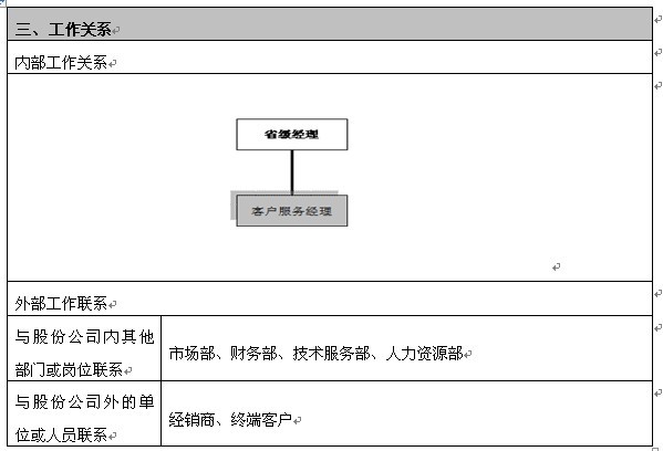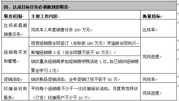 上述案例的结论是:岗位说明书的实际功能是让销售人员明白自己为了达成目标要做什么?公司内部有哪些资源可以支持他达成目标?除此两方面外的其它内容,对于岗位操作人员都是无效的。因此,岗位说明书的格式及内容,做到简明有效就好。
