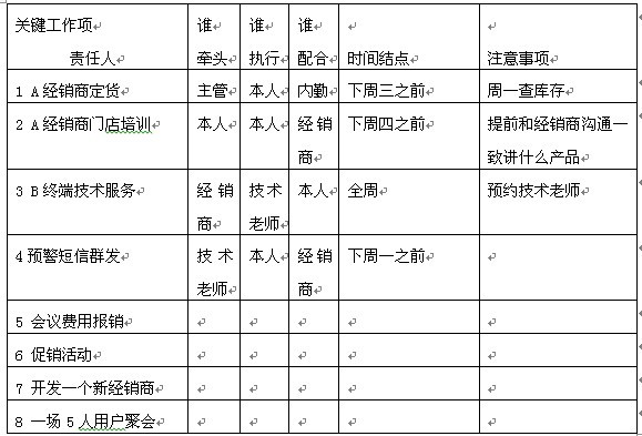 上述工作计划表格载明了关键工作项、责任人分工、时间结点以及注意事项,一线销售人员思路清晰、行动准确,同时作为销售主管辅导检查的依据。