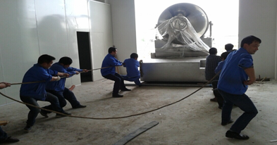 午饭后,大家顾不上休息。来自各个部门的十五六名青壮年,聚集在设备安装现场。在郝康厂长的带领和指挥下,所有人一共分为三个小组。第一个小组负责在混合机下面铺设钢管,使二维混合机能始终在钢管上滚动。第二个小组在后面,负责推、撬动混合机。第三个小组则在前面依靠缆绳使劲地拉动混合机。在“一、二、三”的呐喊声中,大家配合的很默契,二维混合机也朝着预定的方向蠕动着。一两个小时过去了,大家的声音变得嘶哑了,衣服也都被汗水浸透了。值得欣慰的是,二维混合机最后以“倒车入库”的方式准确、安全地定位了。