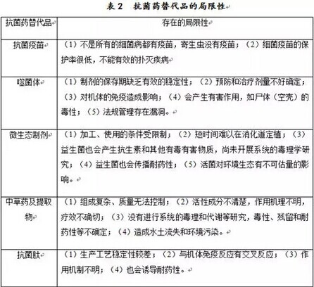 针对兽用抗菌药在使用上出现的一些问题,目前出现了一些抗菌药的替代品,如抗菌疫苗、噬菌体、微生态制剂、中草药及其提取物、群体感应及生物被膜抑制剂、抗菌肽、酶制剂,虽然这些替代品在使用过程中发挥了一定的作用,但是由于存在着不同的局限性而影响限制了使用,所以这些替代品是不能完全替代抗菌药的,具体如表2所示。